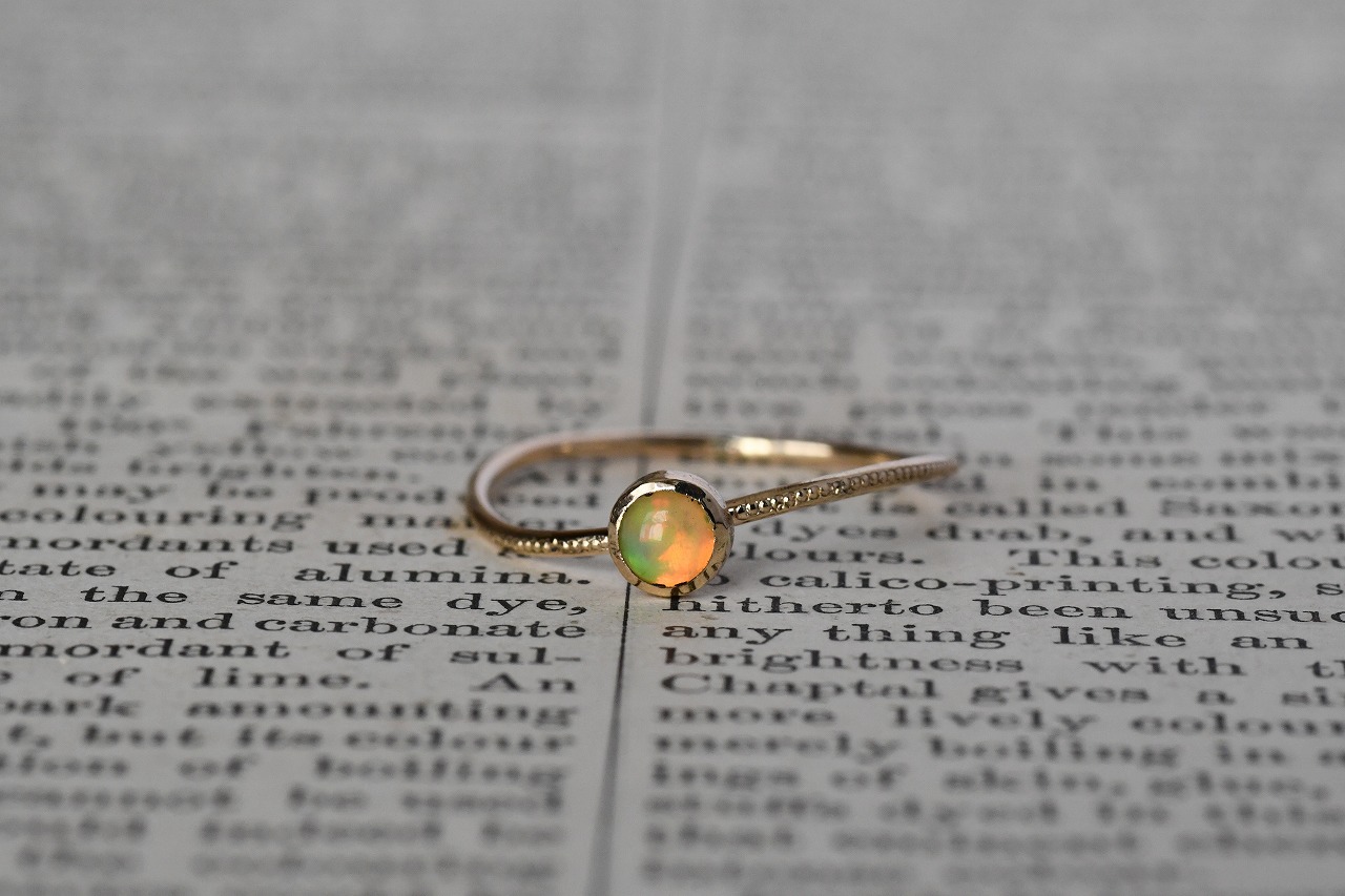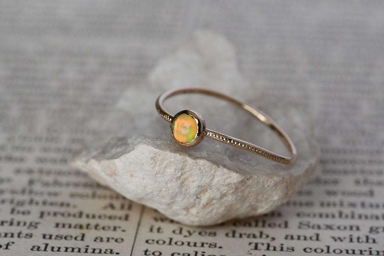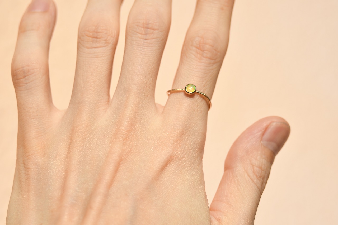 オパールの美しい色の中にある煌きや落ち着いた雰囲気、リング部分をほんの少し曲げることでシャボン玉の舞う様子、無数に煌きシャボン玉をミルを打つことで表現をしてみました。
