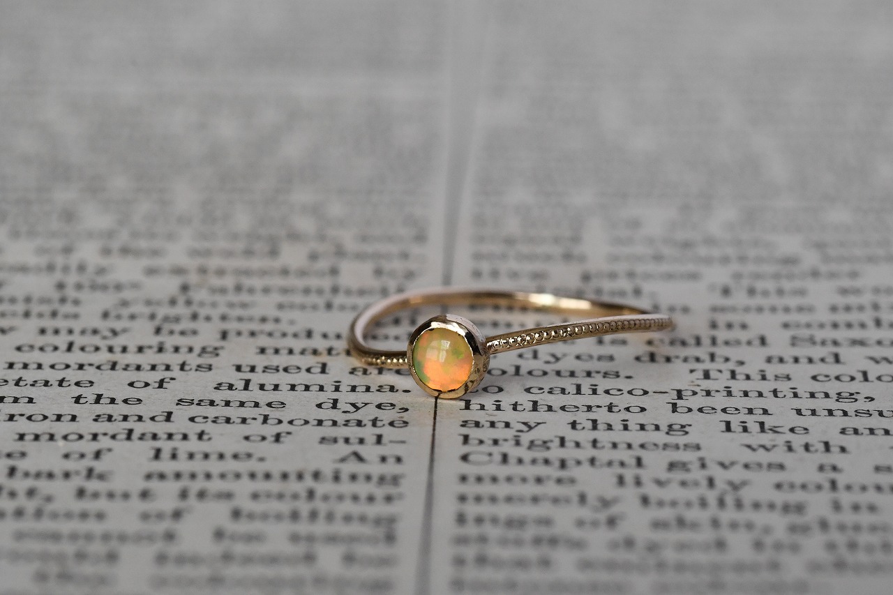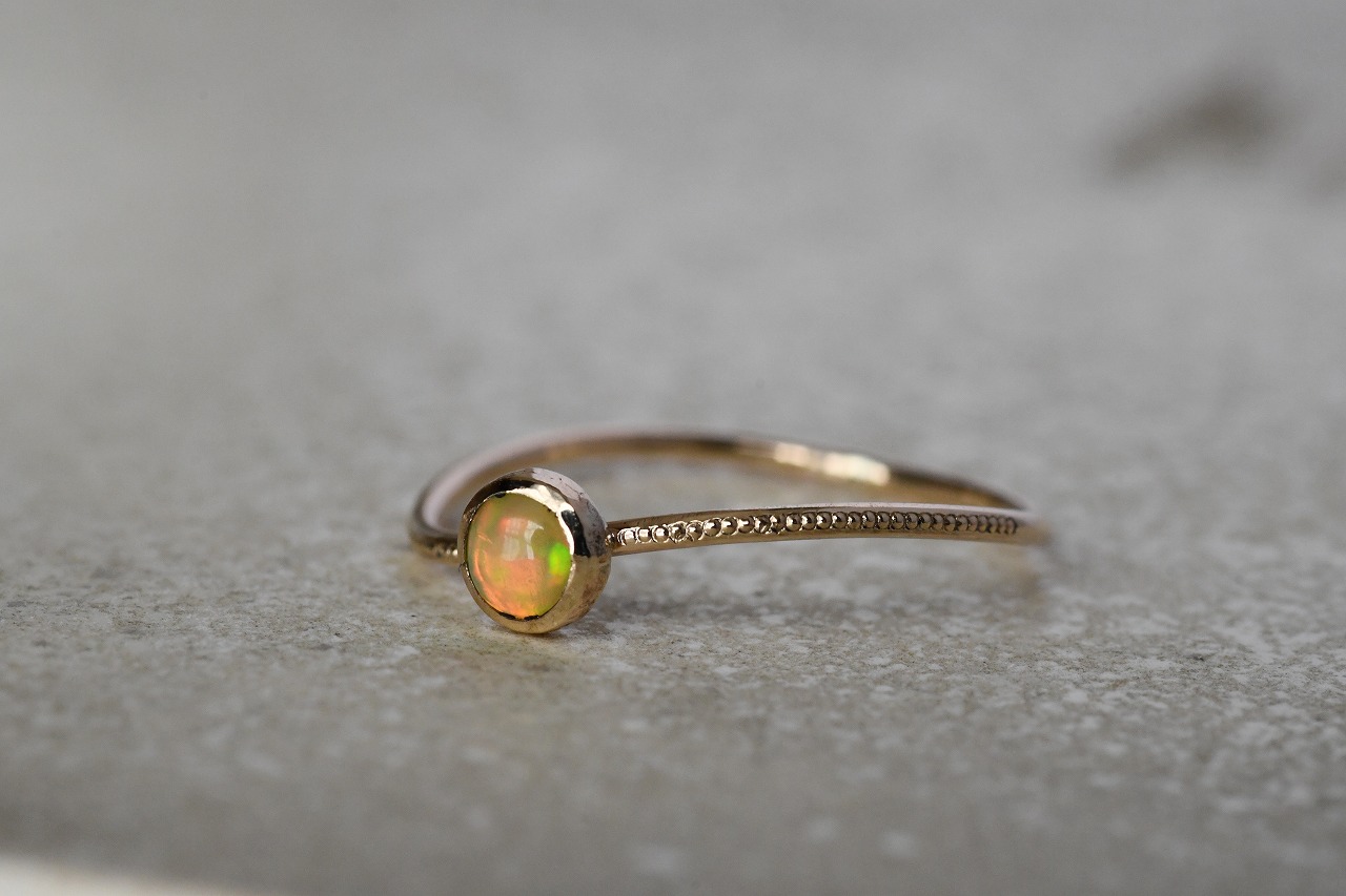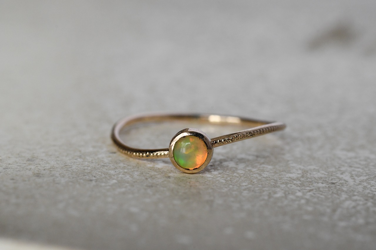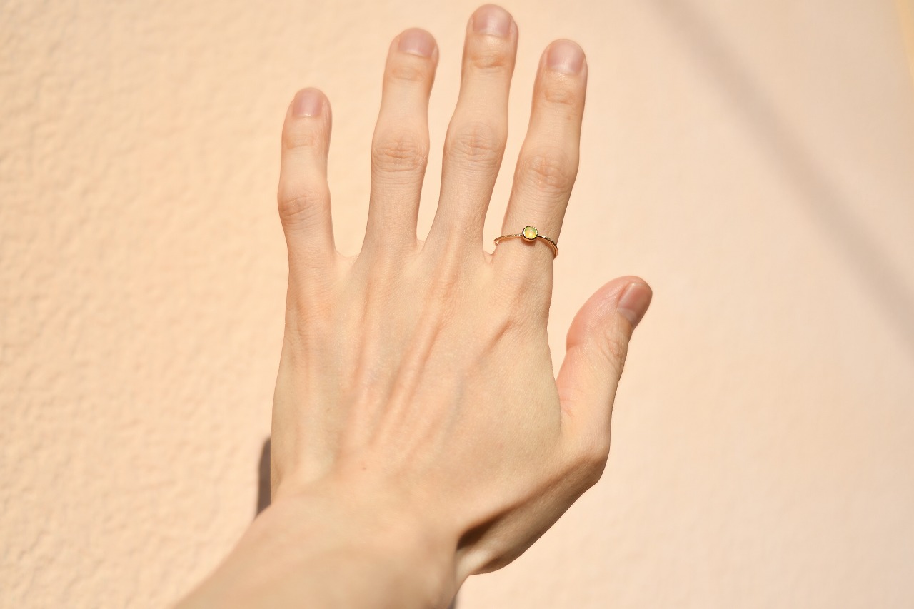 オパールの美しい色の中にある煌きや落ち着いた雰囲気、リング部分をほんの少し曲げることでシャボン玉の舞う様子、無数に煌きシャボン玉をミルを打つことで表現をしてみました。