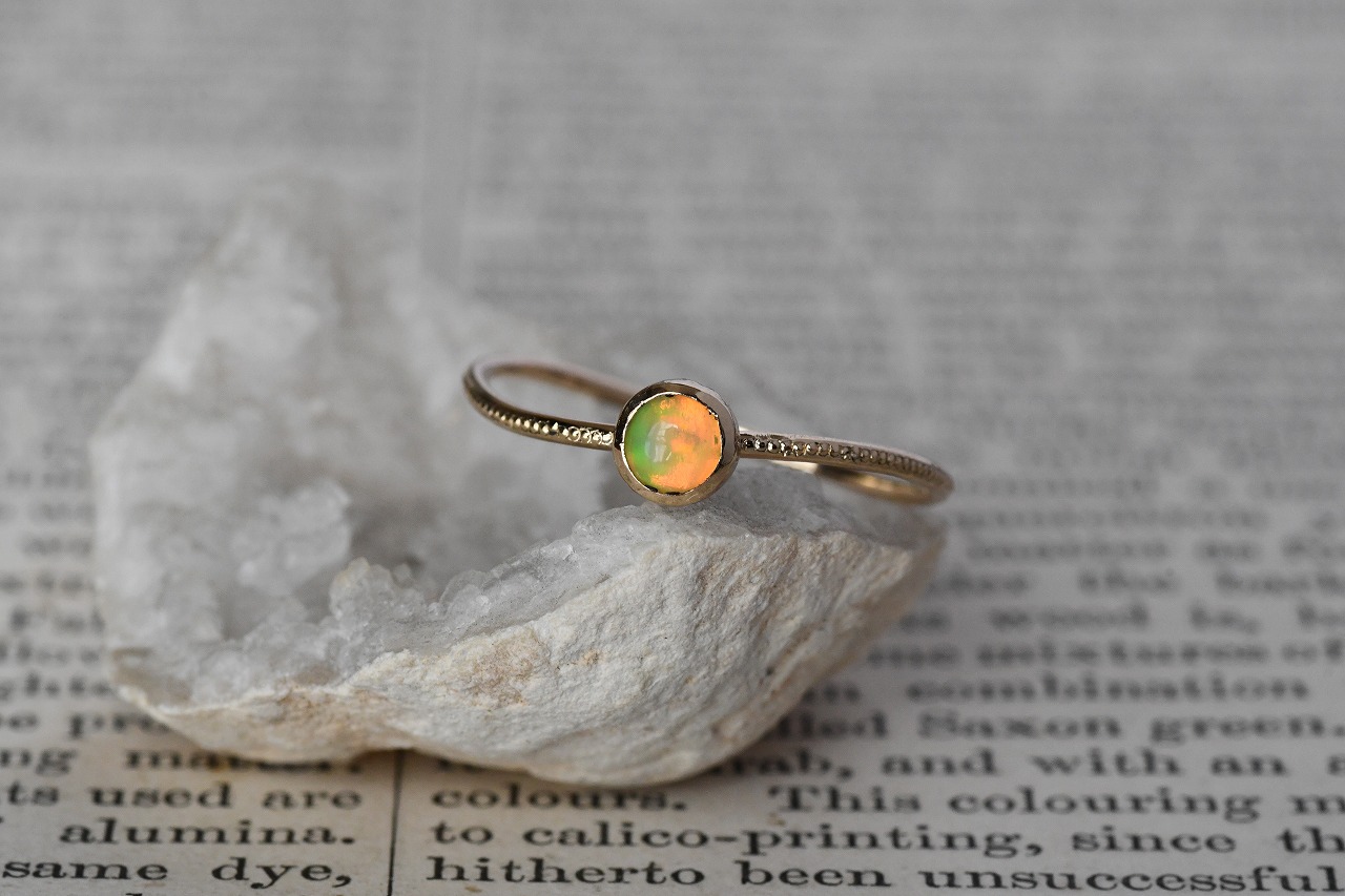 水晶と同じケイ素をメインとする鉱物でその成り立ちから水分が多く高度の柔らかい石です。見る角度によって虹色に輝く遊色効果のあるものをプレシャスオパール、きらめかないものをコモンオパールと呼んでいます。数ある石の中でもとくに明るいエネルギーを持つ石といわれ、自由なエネルギーを象徴し、想像力を高め、内面の隠れた才能を引き出す効果もあるようです。直射日光に弱いので取扱いに少しだけ注意が必要です。