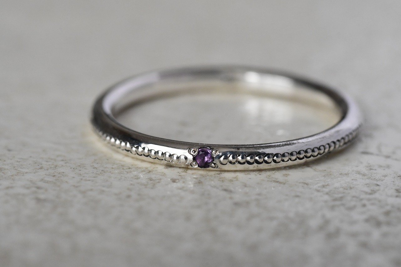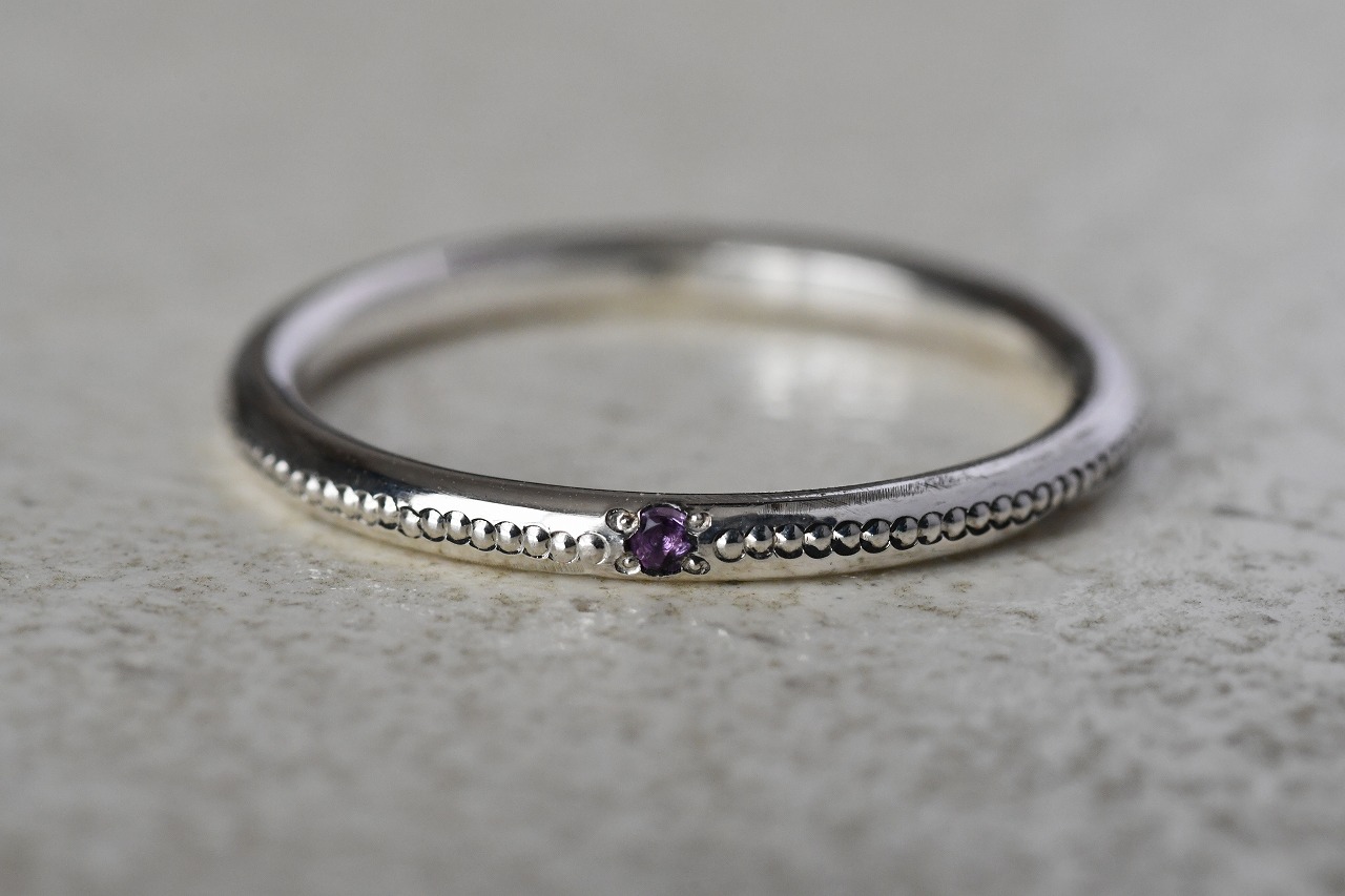 2月の誕生石であるアメジストはその透明な紫色の輝きが最大の特徴で、古来、エジプトやユダヤ教、キリスト教世界などで装飾品などに使われ、特にキリスト教世界では司教の石といわれ全員がこの指輪をはめていたといわれています。古くから「酔わないための石」と伝えれれていて、感情の波などに飲み込まれて酔わないようにという願いも込められていたようです。