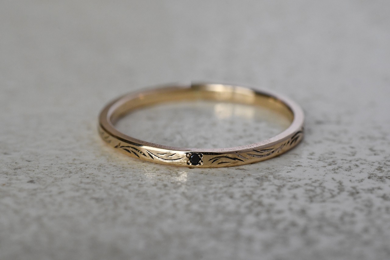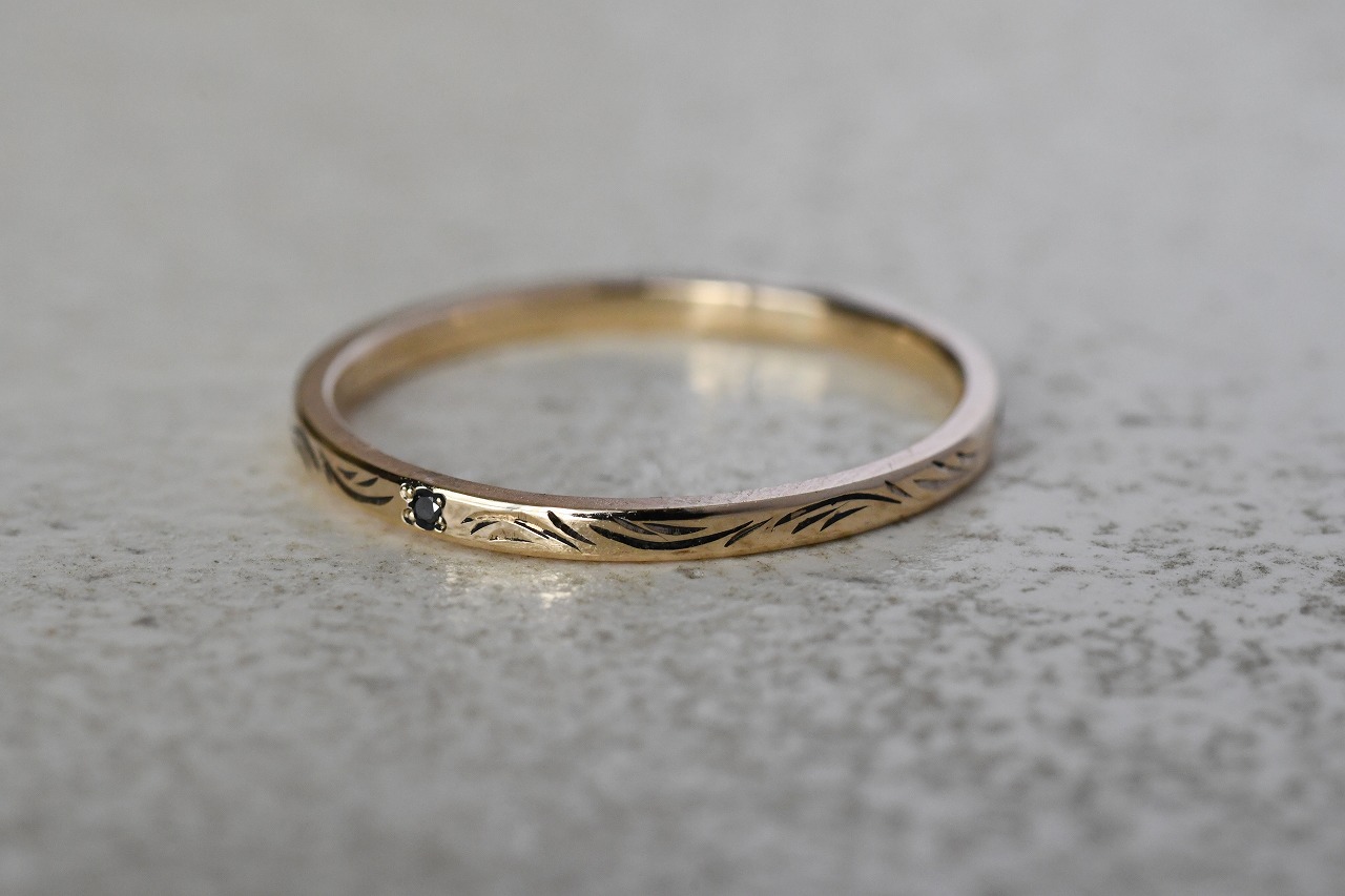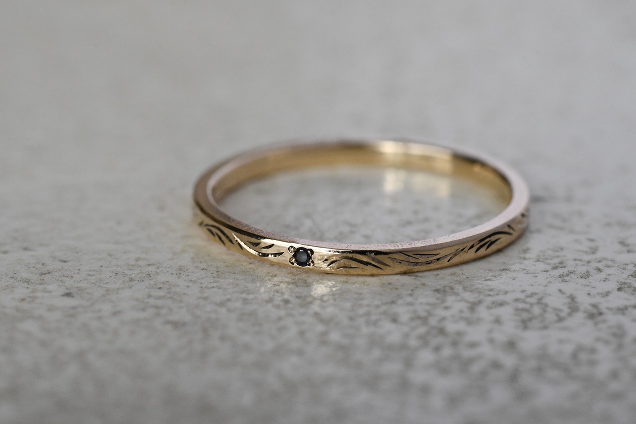 細身のプレーンな平打ちリングに一粒ブラックダイアモンドを留めたシンプルなデザインの作品に稲穂イメージの彫りを一周入れて制作を行っております。