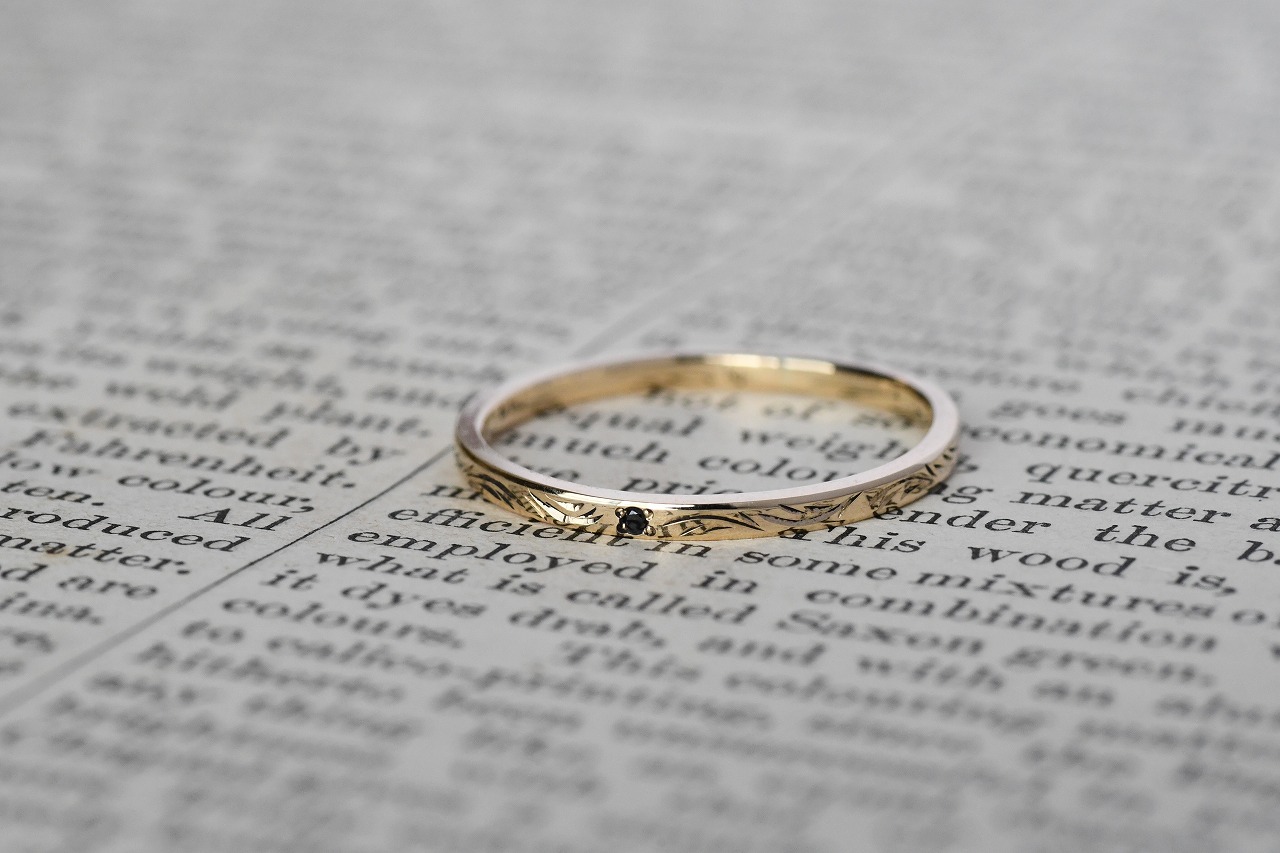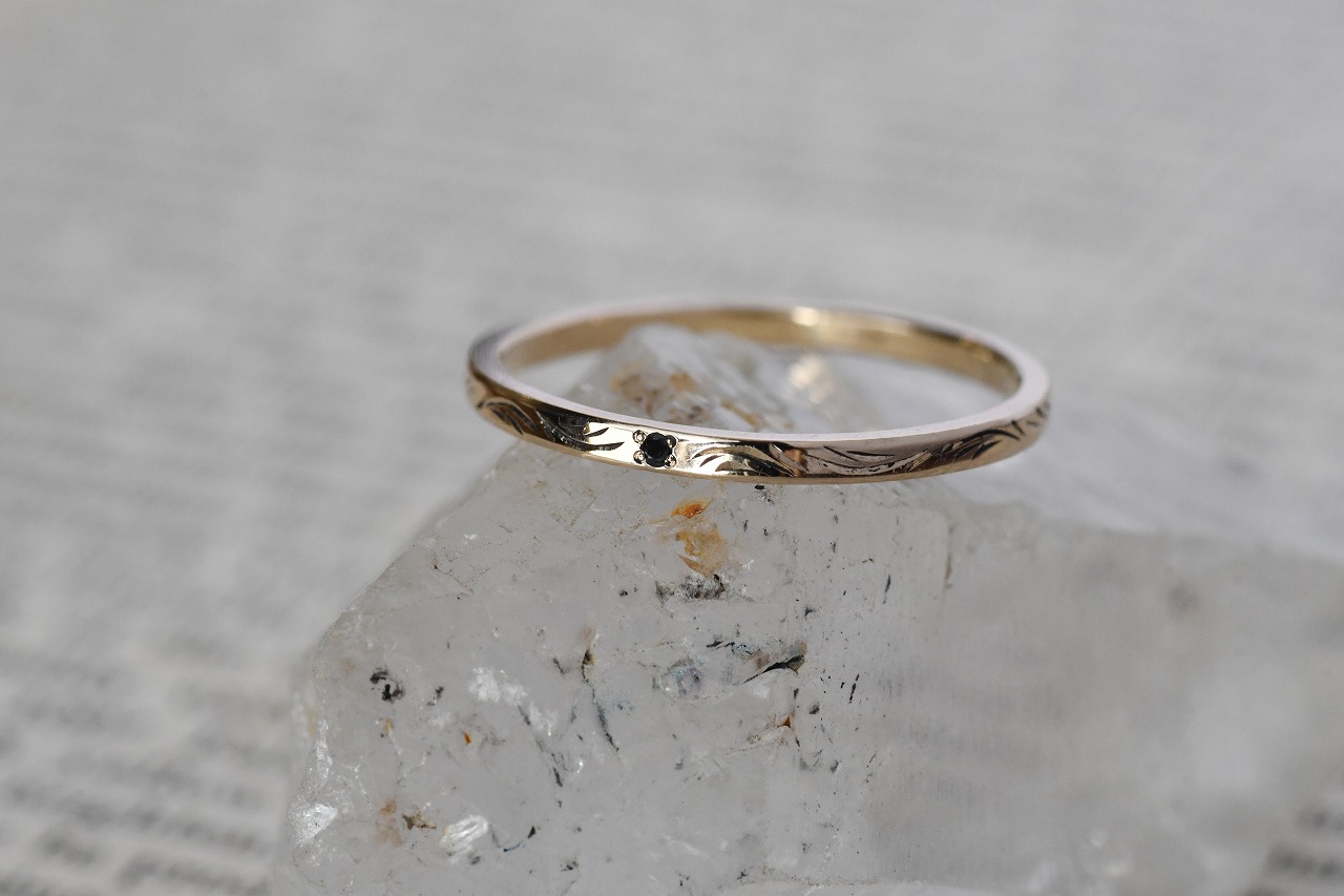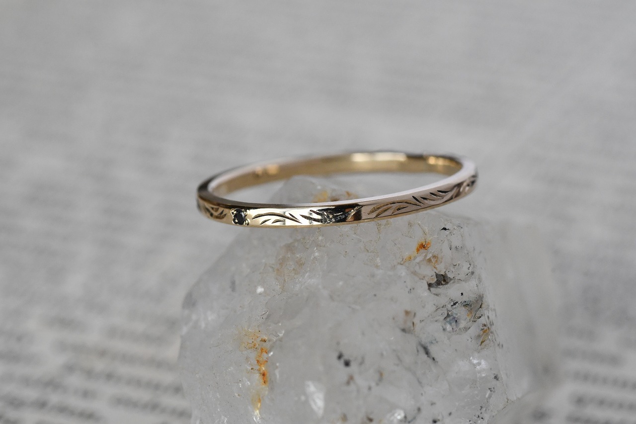 細身のプレーンな平打ちリングに一粒ブラックダイアモンドを留めたシンプルなデザインの作品に稲穂イメージの彫りを一周入れて制作を行っております。