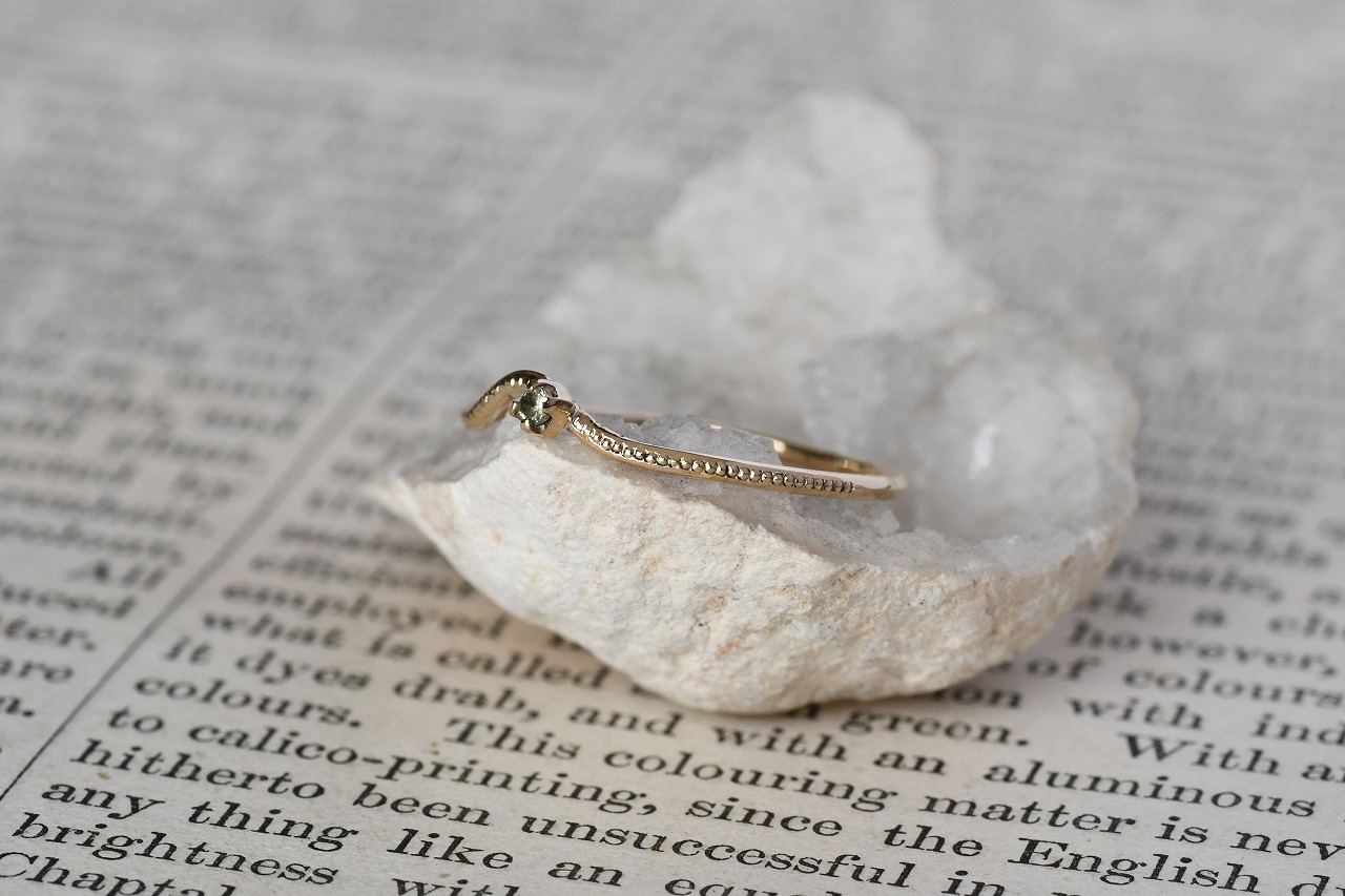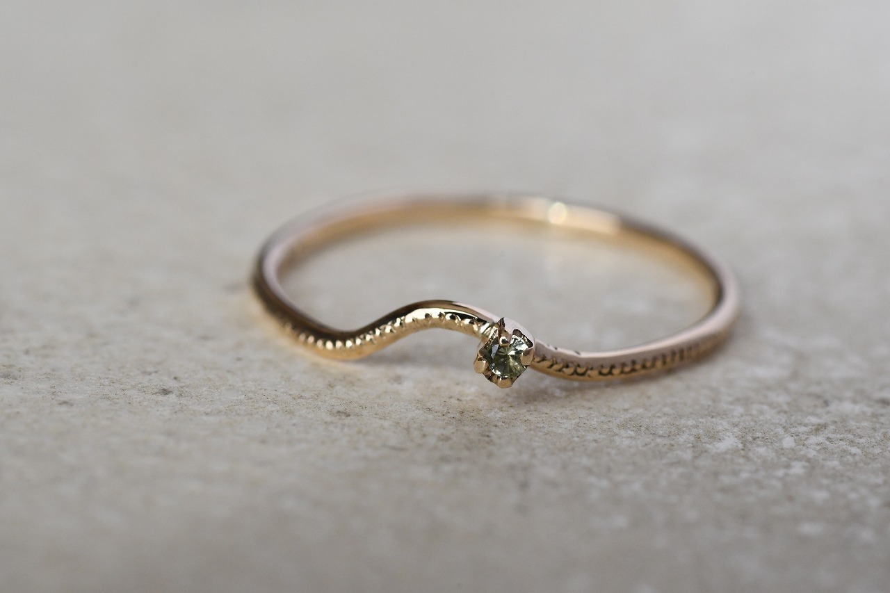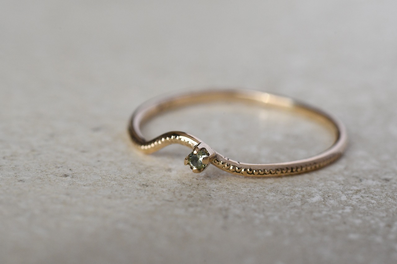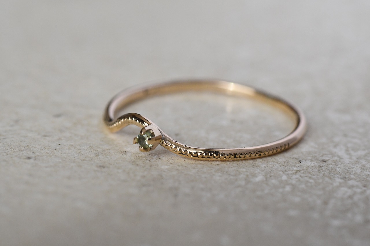 小さくて明るい雰囲気が魅力のペリドットを一粒留めて、リングはほんの少し曲げを行い半面にミルを打って制作しております。