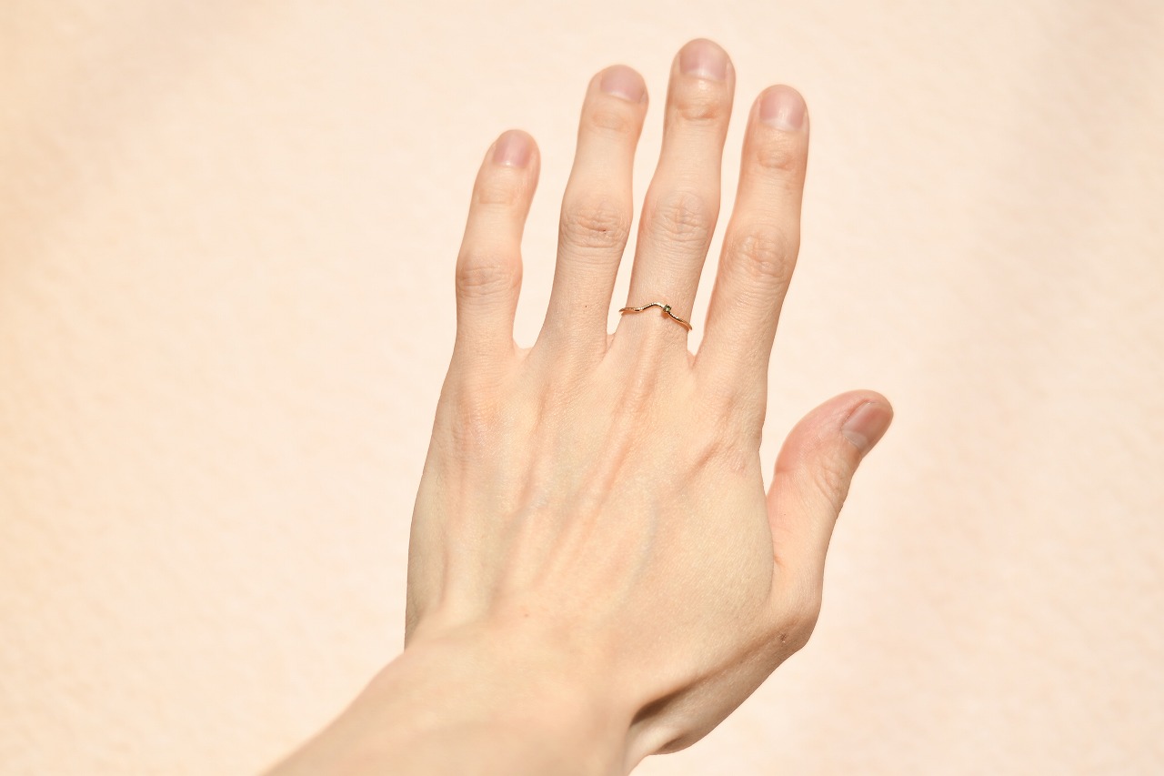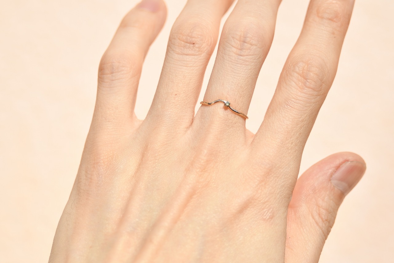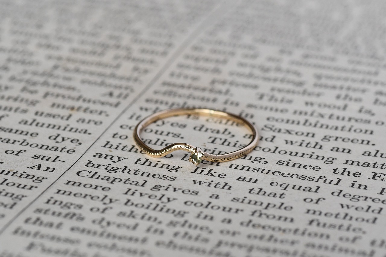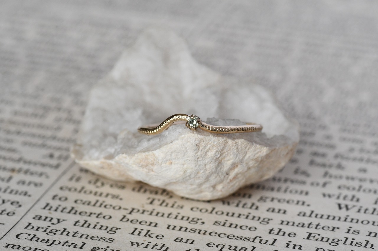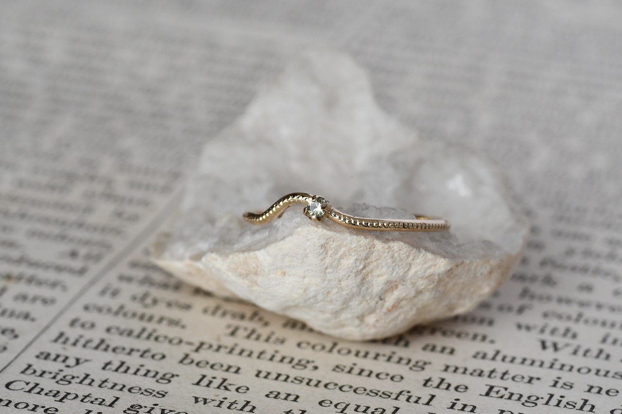 小さくて明るい雰囲気が魅力のペリドットを一粒留めて、リングはほんの少し曲げを行い半面にミルを打って制作しております。